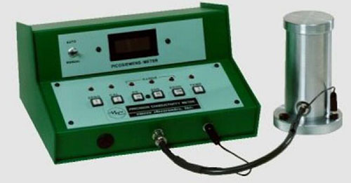 向測量槽內(nèi)的兩個同心電極間注入規(guī)定體積(100mL)的試樣,用三軸電纜連接電導率測量槽和控制臺中的高靈敏靜電計,施加直流電于這兩個電極?;谙嚓P物理學原理,測量槽常數(shù)是恒定的和可計算的。因此,電流峰值容易轉換并以pS/m形式顯示,即通常所說的CU值。如ASTM D4308標準所述,1CU=1pS/m。電導率測量槽采用了ENCLOSURE,起到了靜電屏蔽的作用,而不需要額外的屏蔽物。